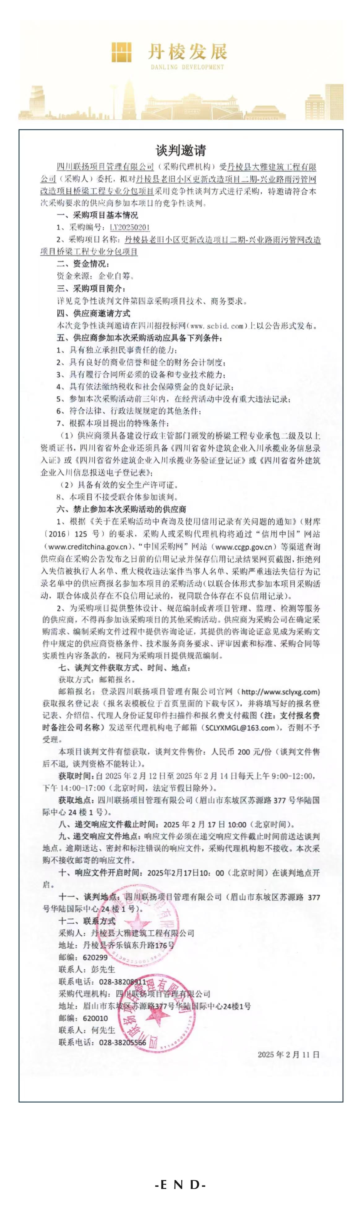 丹棱縣老舊小區(qū)更新改造項目二期-興業(yè)路雨污管網(wǎng)改造項目橋梁工程專業(yè)分包項目談判邀請公告