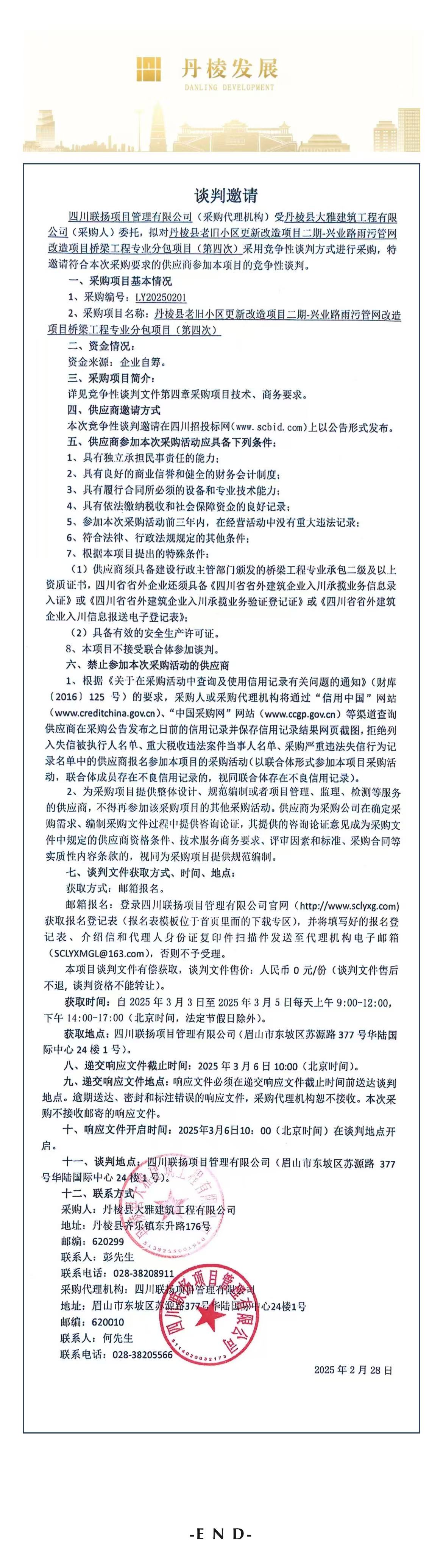 丹棱縣老舊小區(qū)更新改造項(xiàng)目二期-興業(yè)路雨污管網(wǎng)改造項(xiàng)目橋梁工程專業(yè)分包項(xiàng)目談判邀請(qǐng)公告(第四次)
