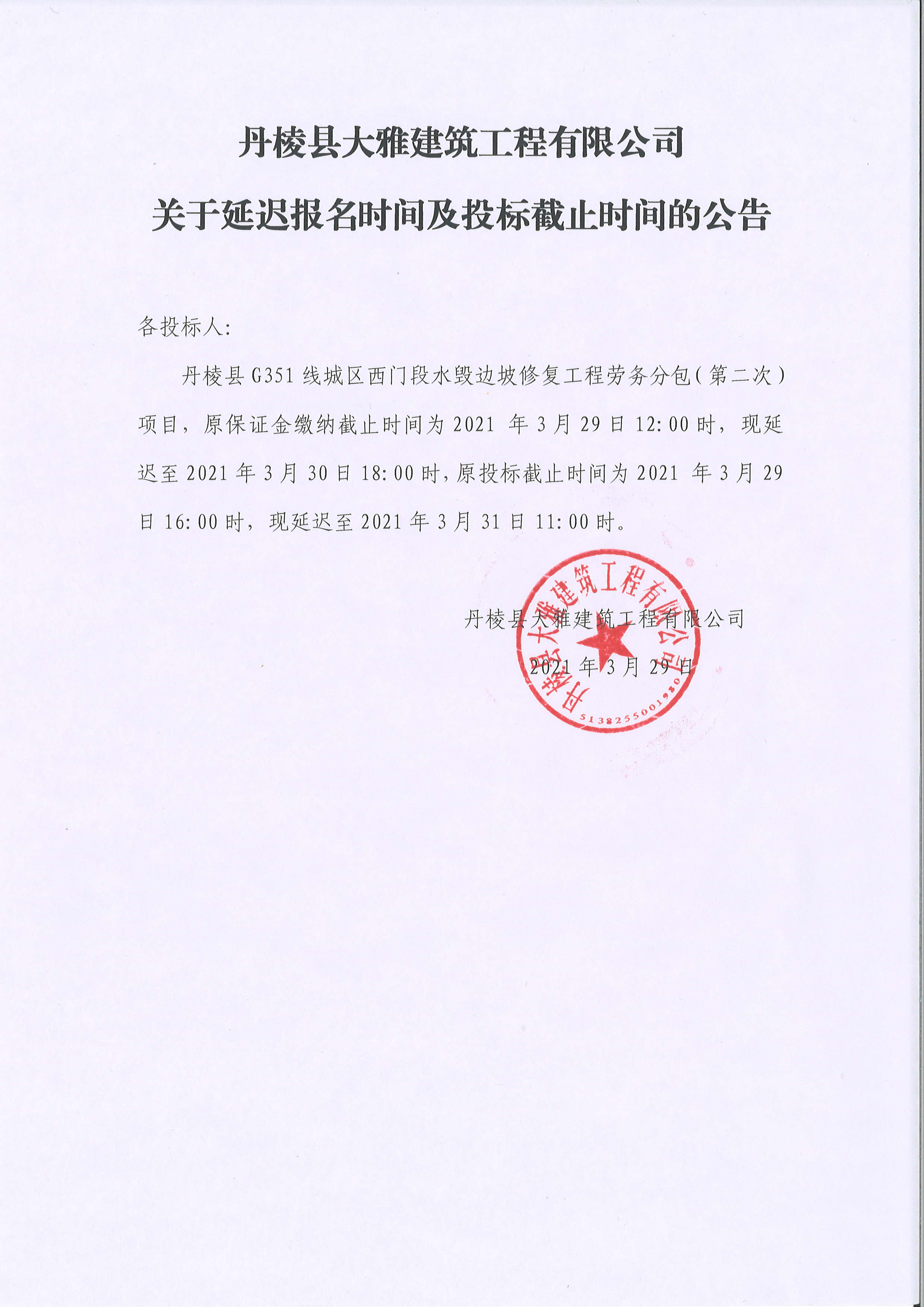 【大雅建筑公司】丹棱縣G351線城區(qū)西門段水毀邊坡修復(fù)工程勞務(wù)分包(第二次)延遲開標(biāo)時間公告