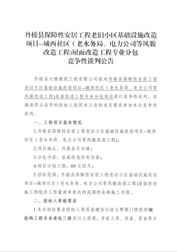 【大雅建筑公司】丹棱縣保障性安居工程老舊小區(qū)基礎(chǔ)設(shè)施改造項目--城西社區(qū)(老水務(wù)局、電力公司等風貌改造工程)屋面改造工程專業(yè)分包競爭性談判公告