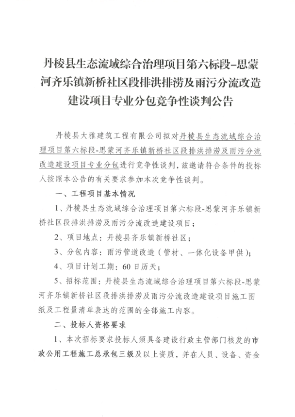 【大雅建筑公司】丹棱縣生態(tài)流域綜合治理項(xiàng)目第六標(biāo)段-思蒙河齊樂(lè)鎮(zhèn)新橋社區(qū)段排洪排澇及雨污分流改造建設(shè)項(xiàng)目專業(yè)分包競(jìng)爭(zhēng)性談判公告
