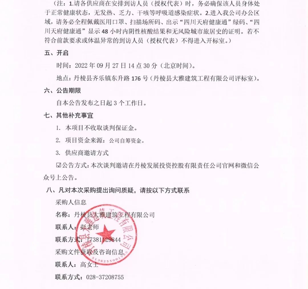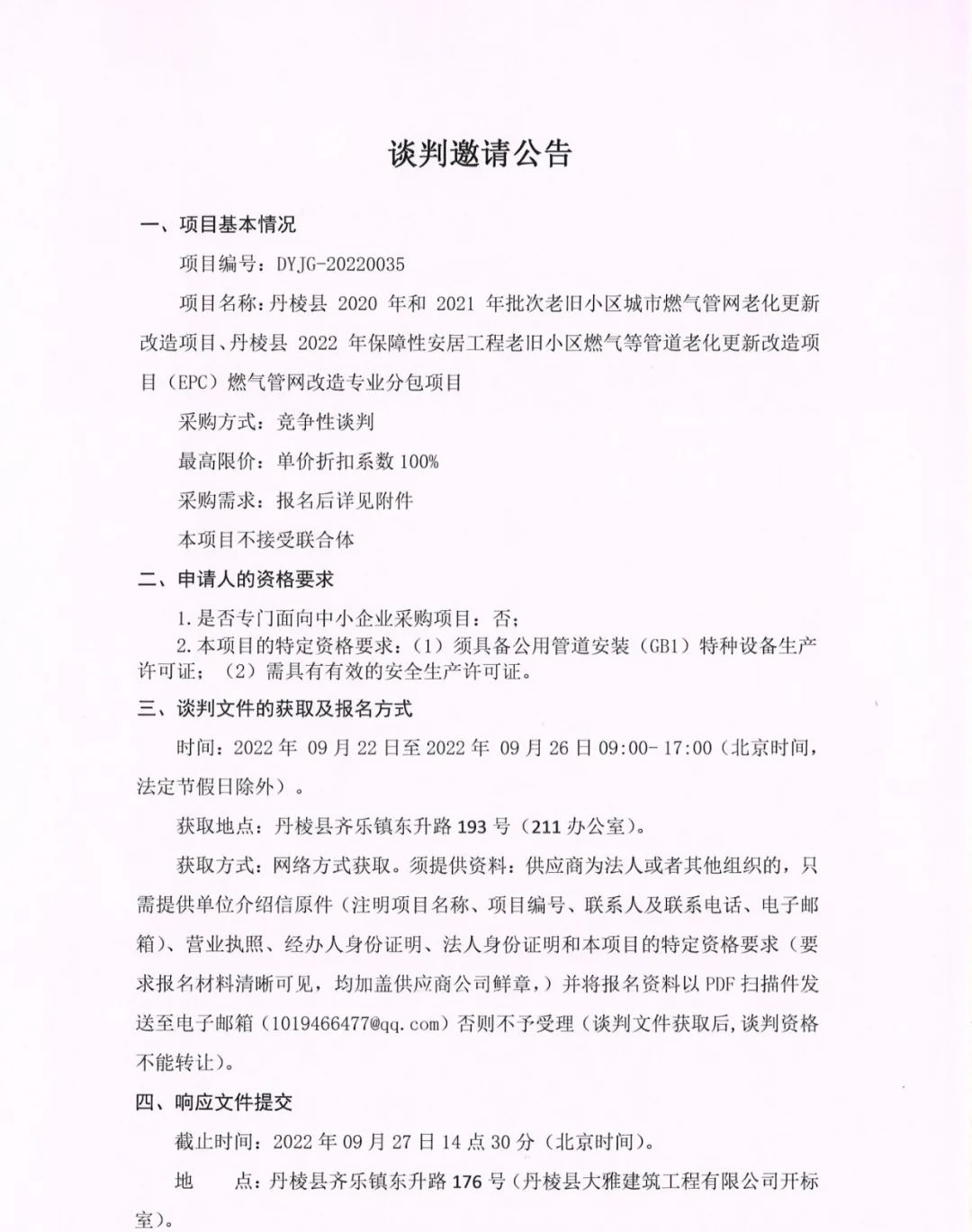 丹棱縣 2020 年、2021年及2022年批次老舊小區(qū)城市燃?xì)夤芫W(wǎng)老化更新改造項目燃?xì)夤芫W(wǎng)改造專業(yè)分包項目談判邀請公告