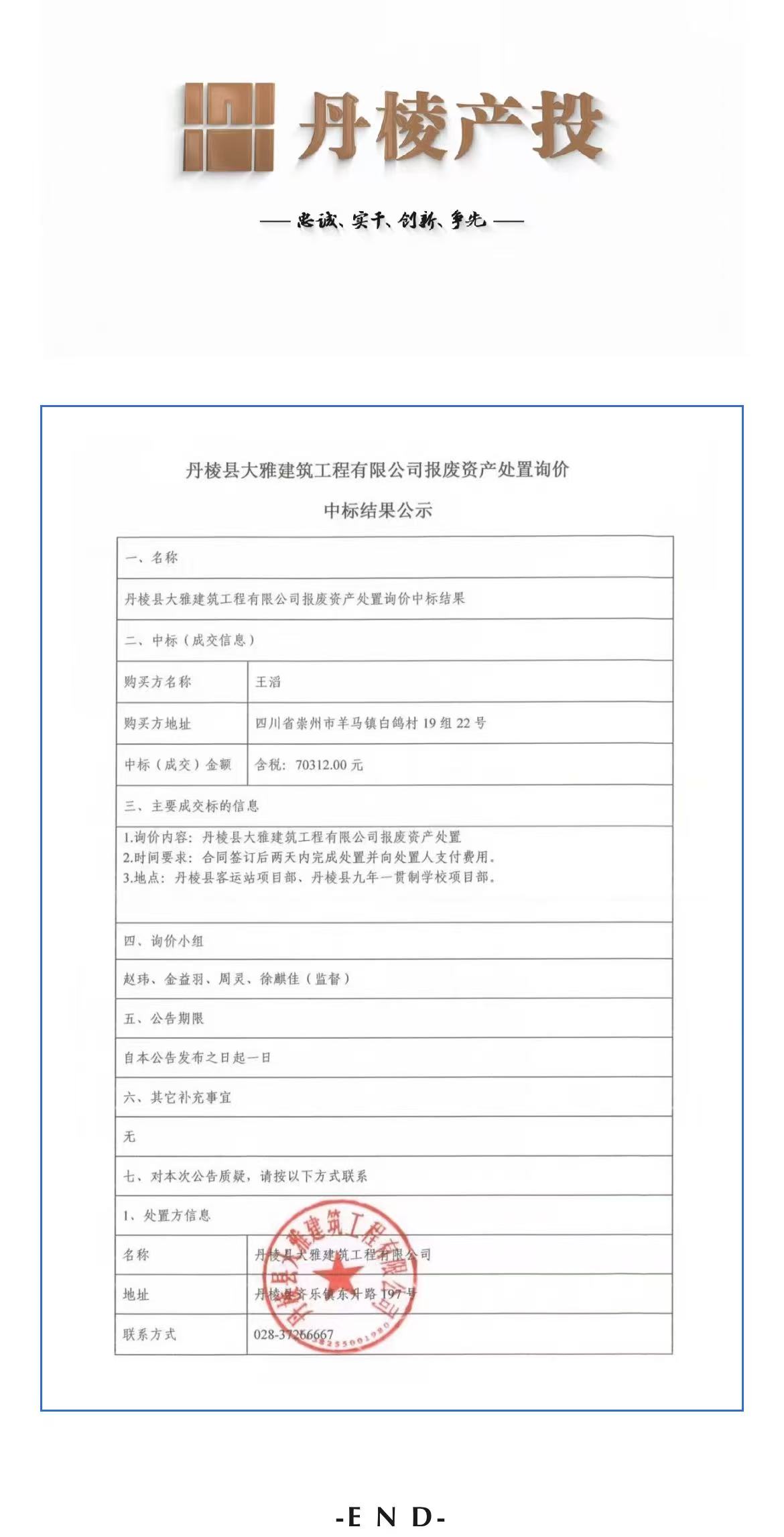 丹棱縣大雅建筑工程有限公司報(bào)廢資產(chǎn)處置詢價中標(biāo)結(jié)果公示