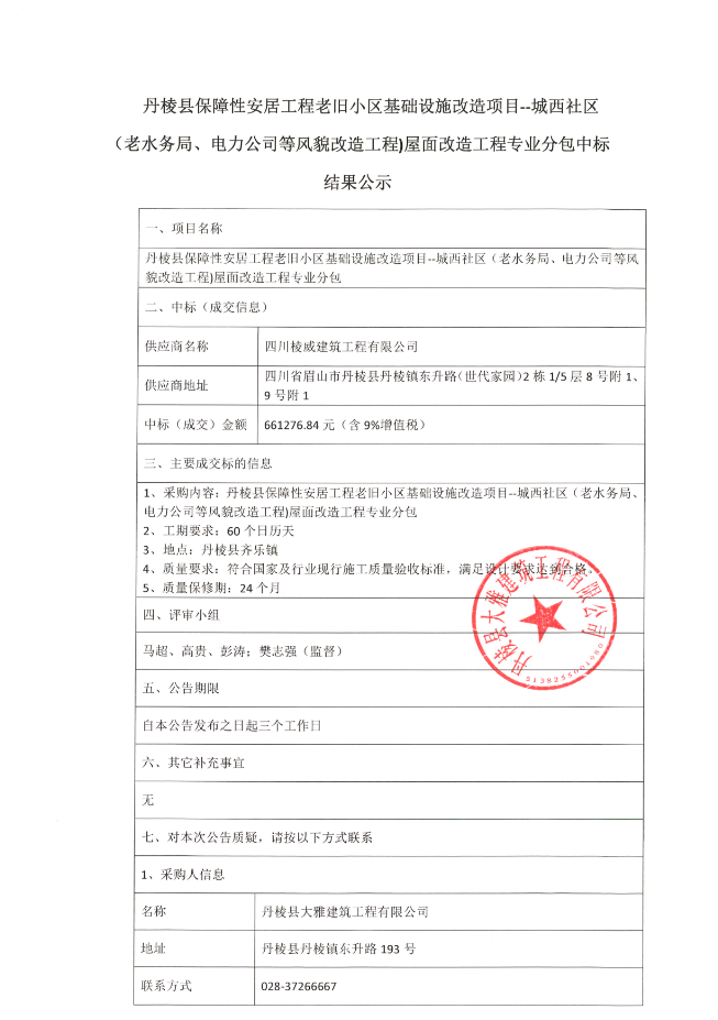 【大雅建筑公司】丹棱縣保障性安居工程老舊小區(qū)基礎(chǔ)設(shè)施改造項(xiàng)目--城西社區(qū)(老水務(wù)局、電力公司等風(fēng)貌改造工程)屋面改造工程專(zhuān)業(yè)分包中標(biāo)結(jié)果公示