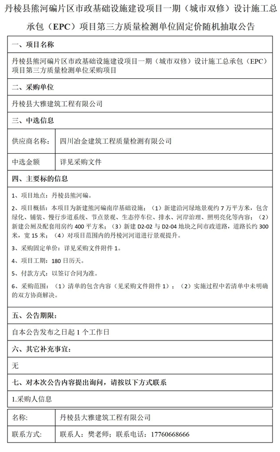 丹棱縣熊河碥片區(qū)市政基礎(chǔ)設(shè)施建設(shè)項(xiàng)目一期(城市雙修)設(shè)計(jì)施工總承包(EPC)項(xiàng)目第三方質(zhì)量檢測(cè)單位固定價(jià)隨機(jī)抽取公告