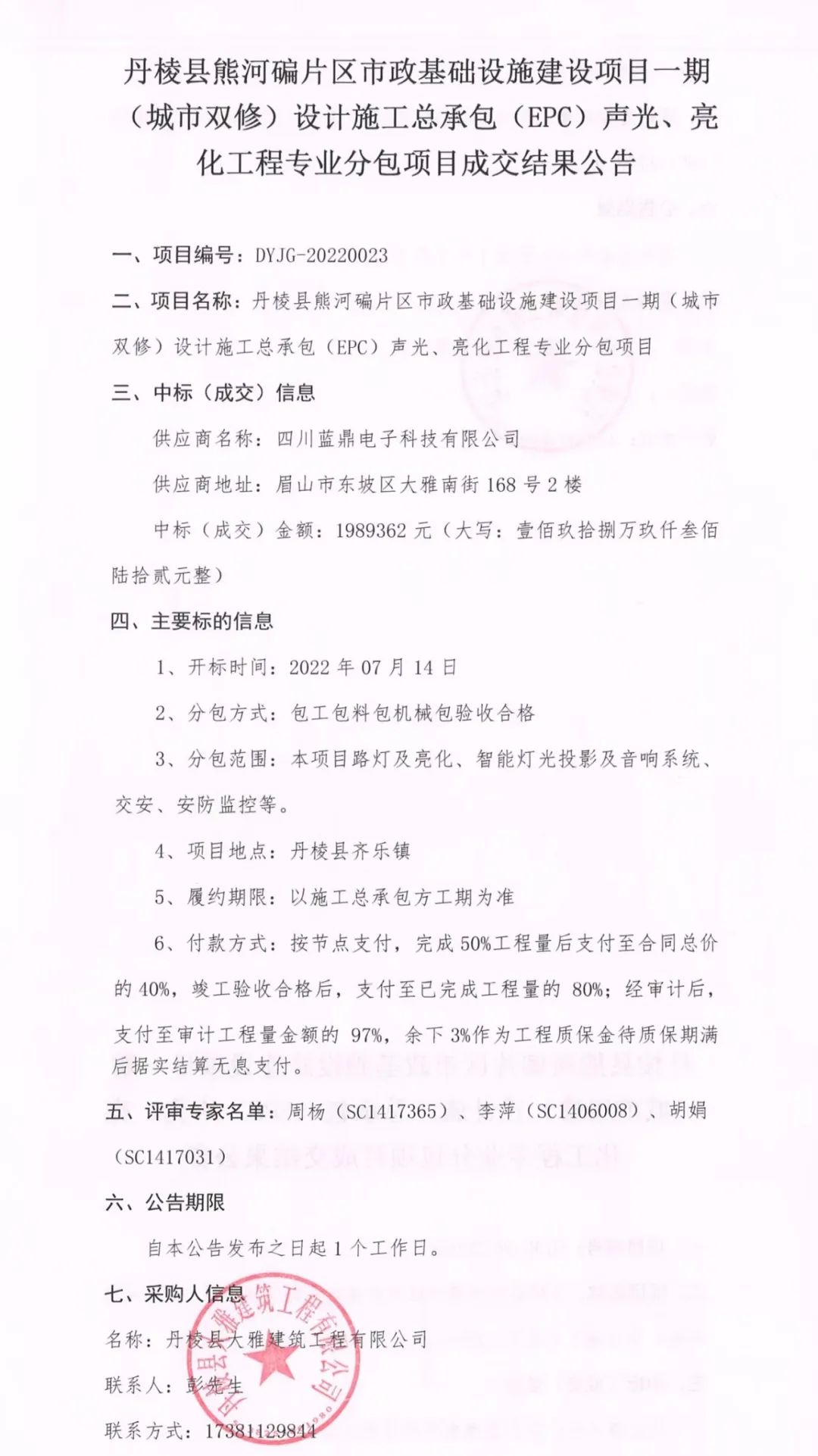 丹棱縣熊河碥片區(qū)市政基礎(chǔ)設(shè)施建設(shè)項目一期(城市雙修)設(shè)計施工總承包(EPC)聲光、亮化工程專業(yè)分包項目成交結(jié)果公告