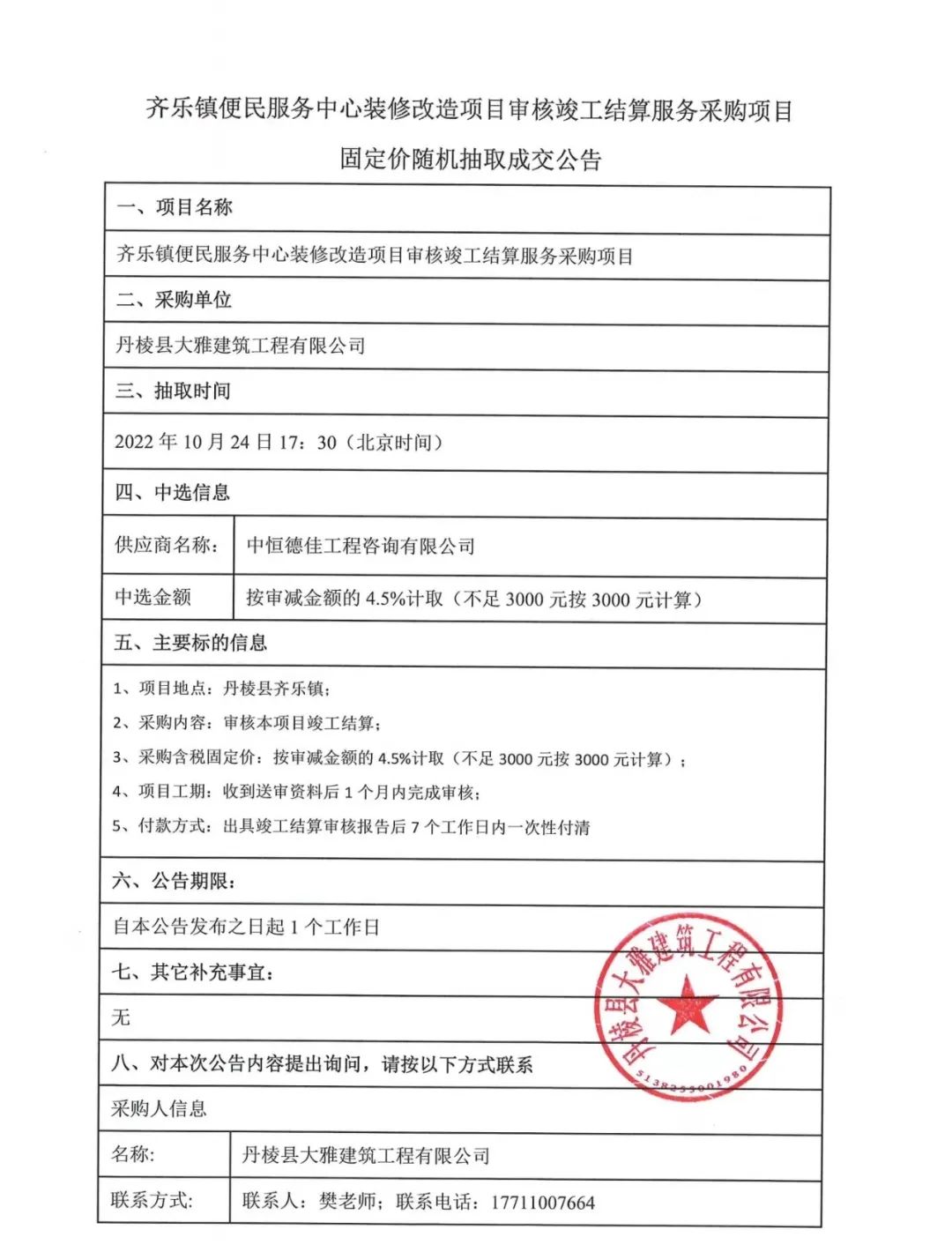 齊樂鎮(zhèn)便民服務(wù)中心裝修改造項(xiàng)目審核竣工結(jié)算服務(wù)采購項(xiàng)目固定價隨機(jī)抽取成交公告
