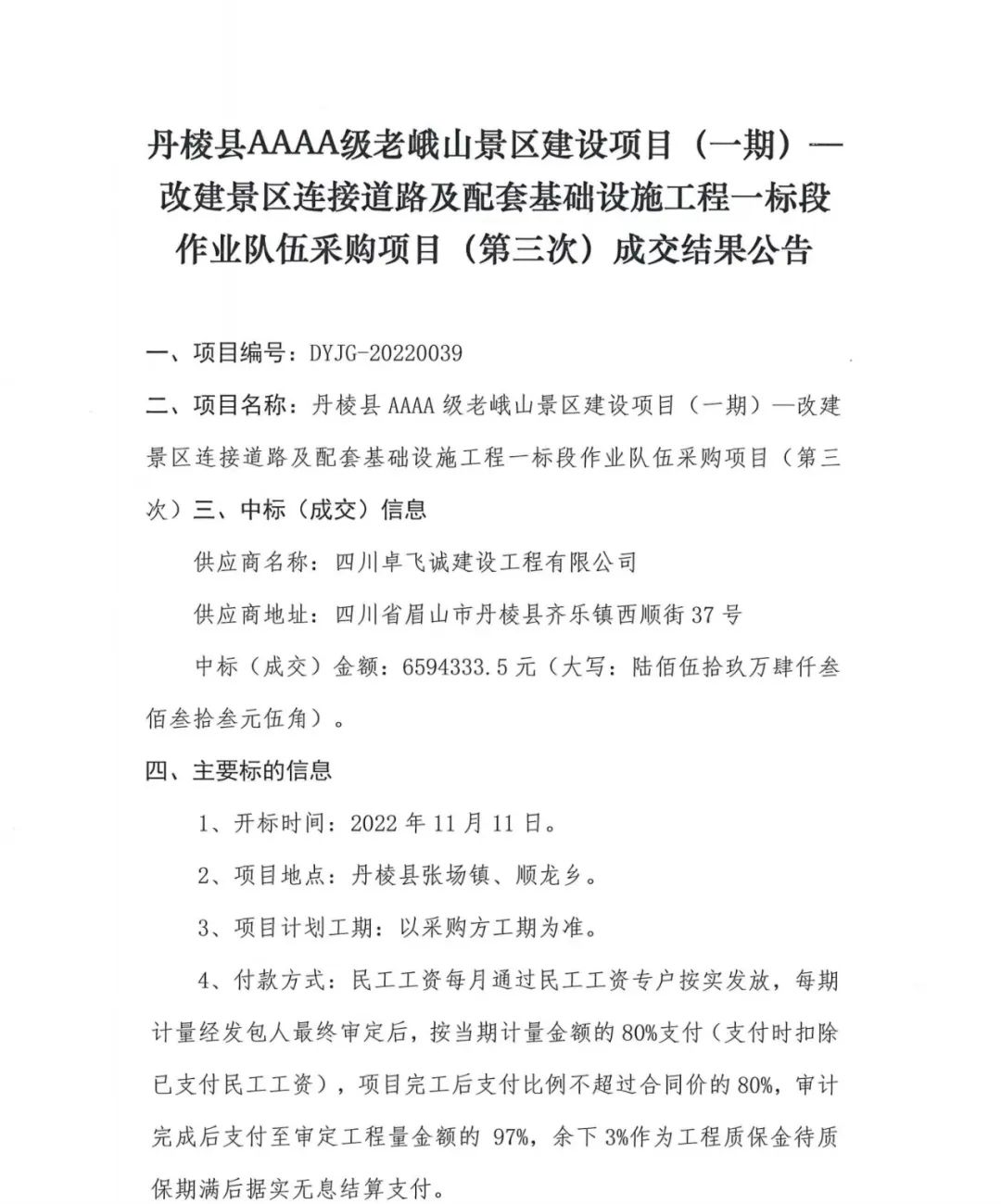 丹棱縣AAAA級老峨山景區(qū)建設(shè)項目 (一期)-改建景區(qū)連接道路及配套基礎(chǔ)設(shè)施工程一標(biāo)段作業(yè)隊伍采購項目 (第三次) 成交結(jié)果公告