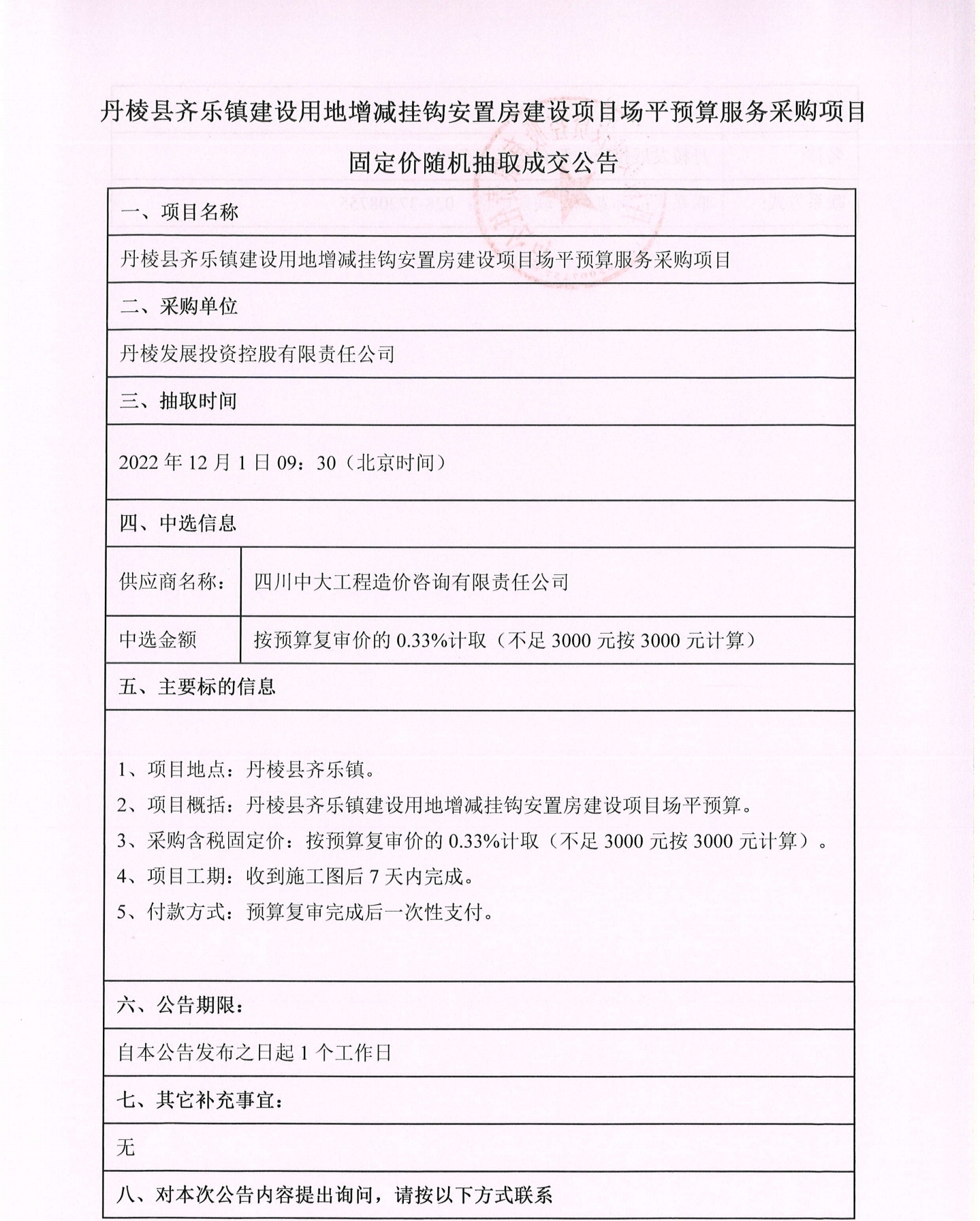 丹棱縣齊樂(lè)鎮(zhèn)建設(shè)用地增減掛鉤安置房建設(shè)項(xiàng)目場(chǎng)平預(yù)算服務(wù)采購(gòu)項(xiàng)目固定價(jià)隨機(jī)抽取成交公告