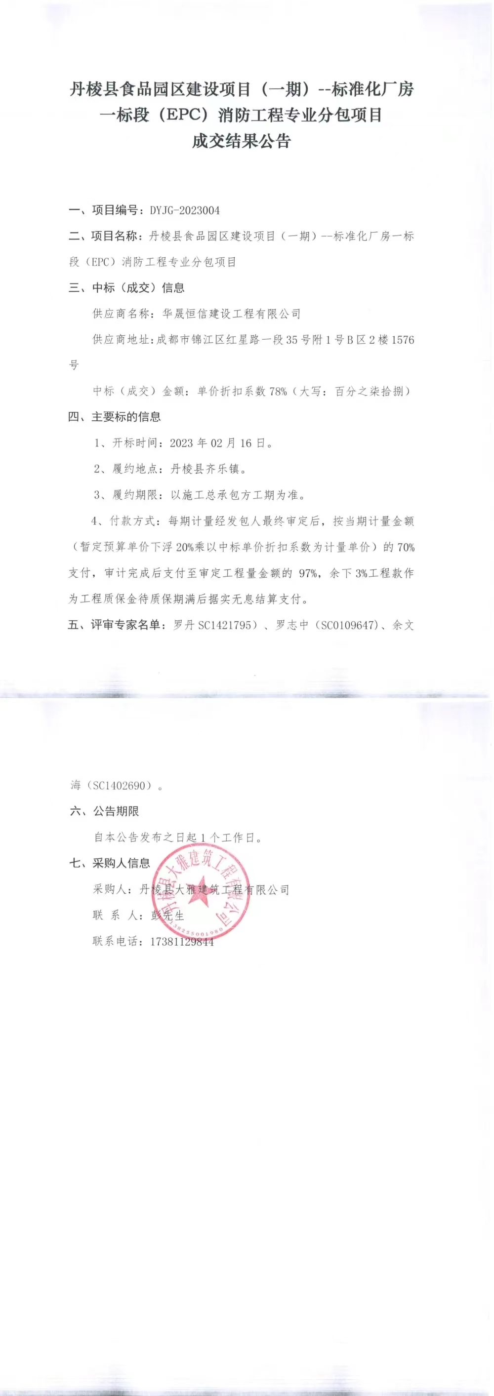 丹棱縣食品園區(qū)建設項目(一期)--標準化廠房一標段(EPC)消防工程專業(yè)分包項目成交結果公告