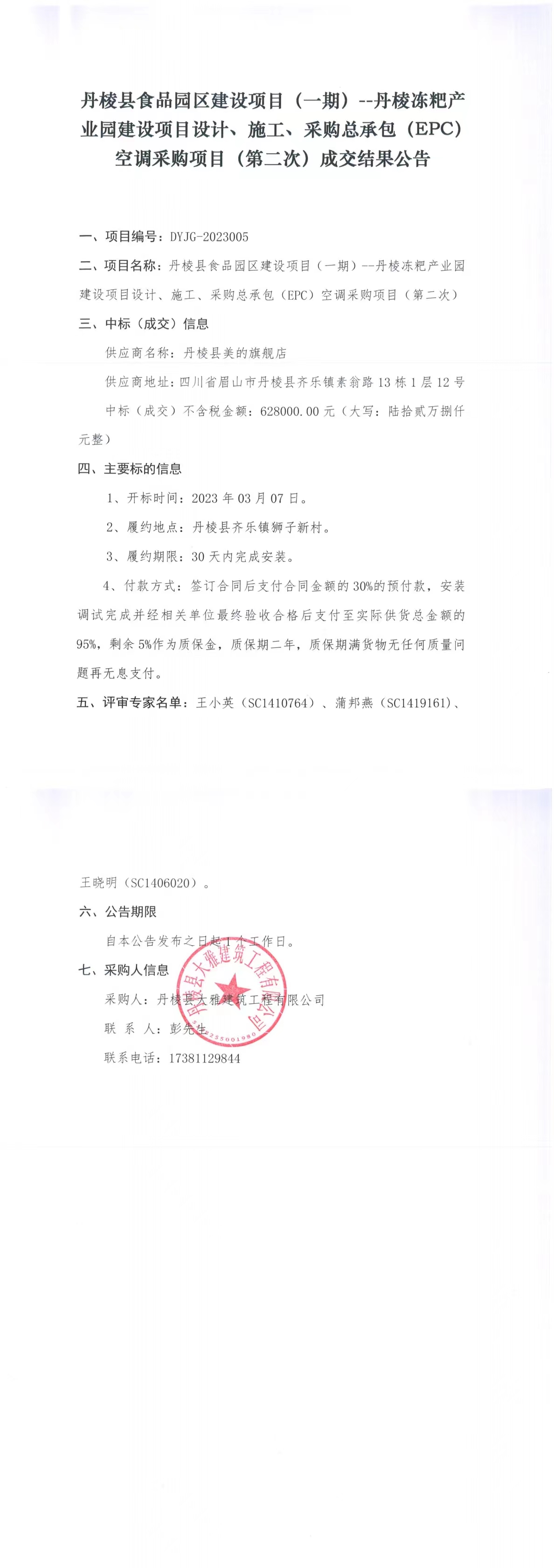 丹棱縣食品園區(qū)建設項目(一期)--丹棱凍粑產(chǎn)業(yè)園建設項目設計、施工、采購總承包(EPC)空調(diào)采購項目(第二次)成交結果公告