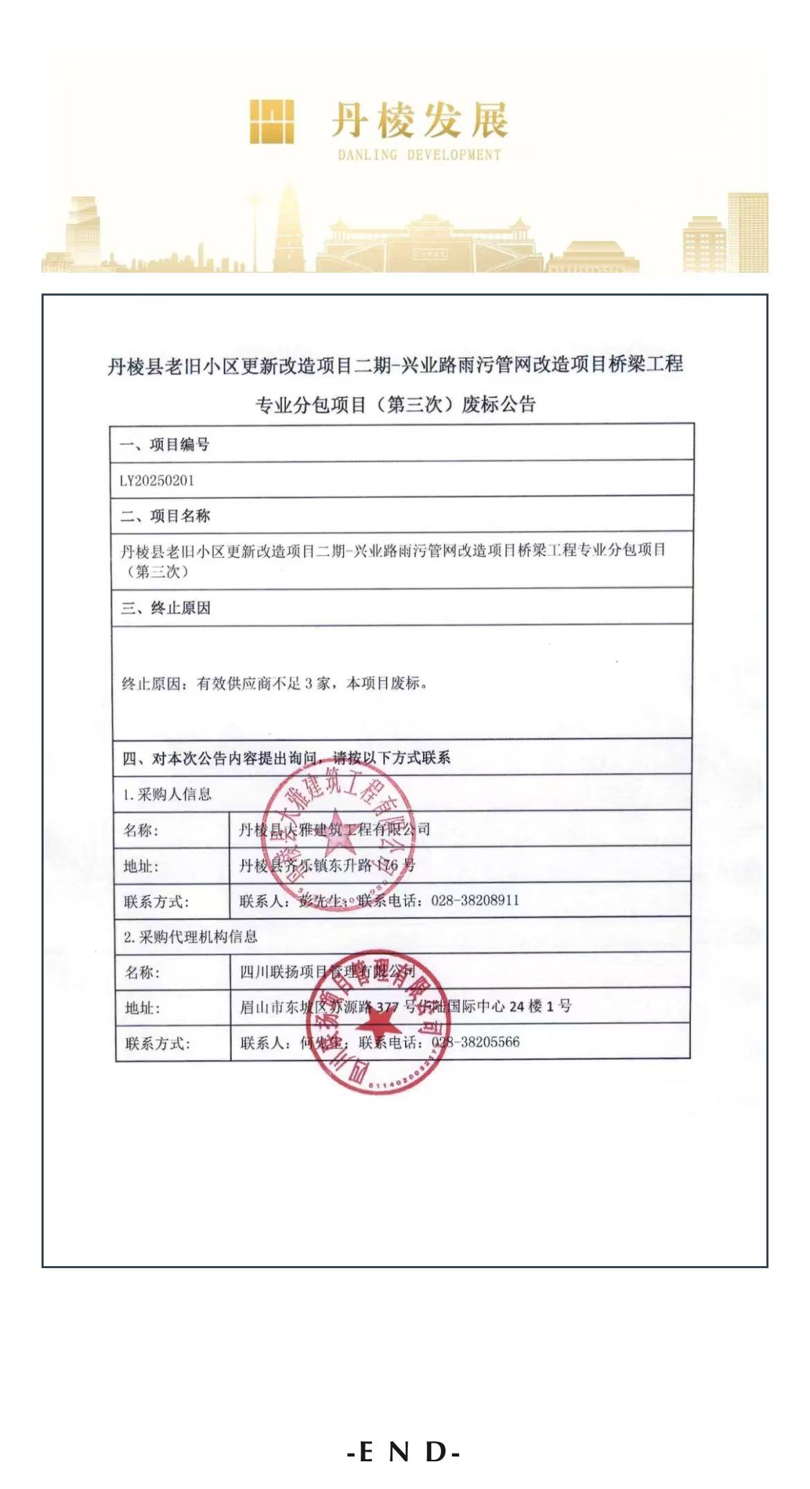 丹棱縣老舊小區(qū)更新改造項(xiàng)目二期-興業(yè)路雨污管網(wǎng)改造項(xiàng)目橋梁工程專(zhuān)業(yè)分包項(xiàng)目(第三次)廢標(biāo)公告