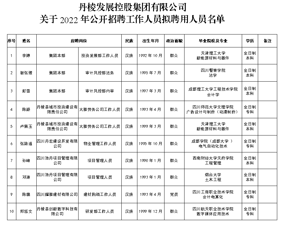 附件:丹棱發(fā)展控股集團(tuán)有限公司關(guān)于2022年公開招聘工作人員擬聘用人員名單