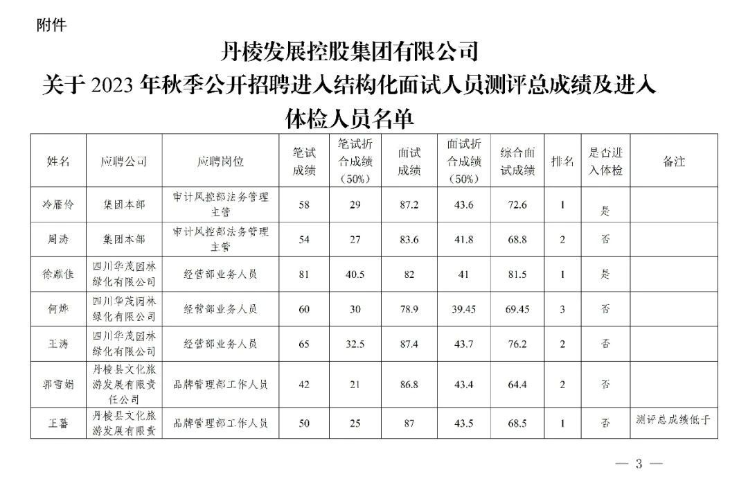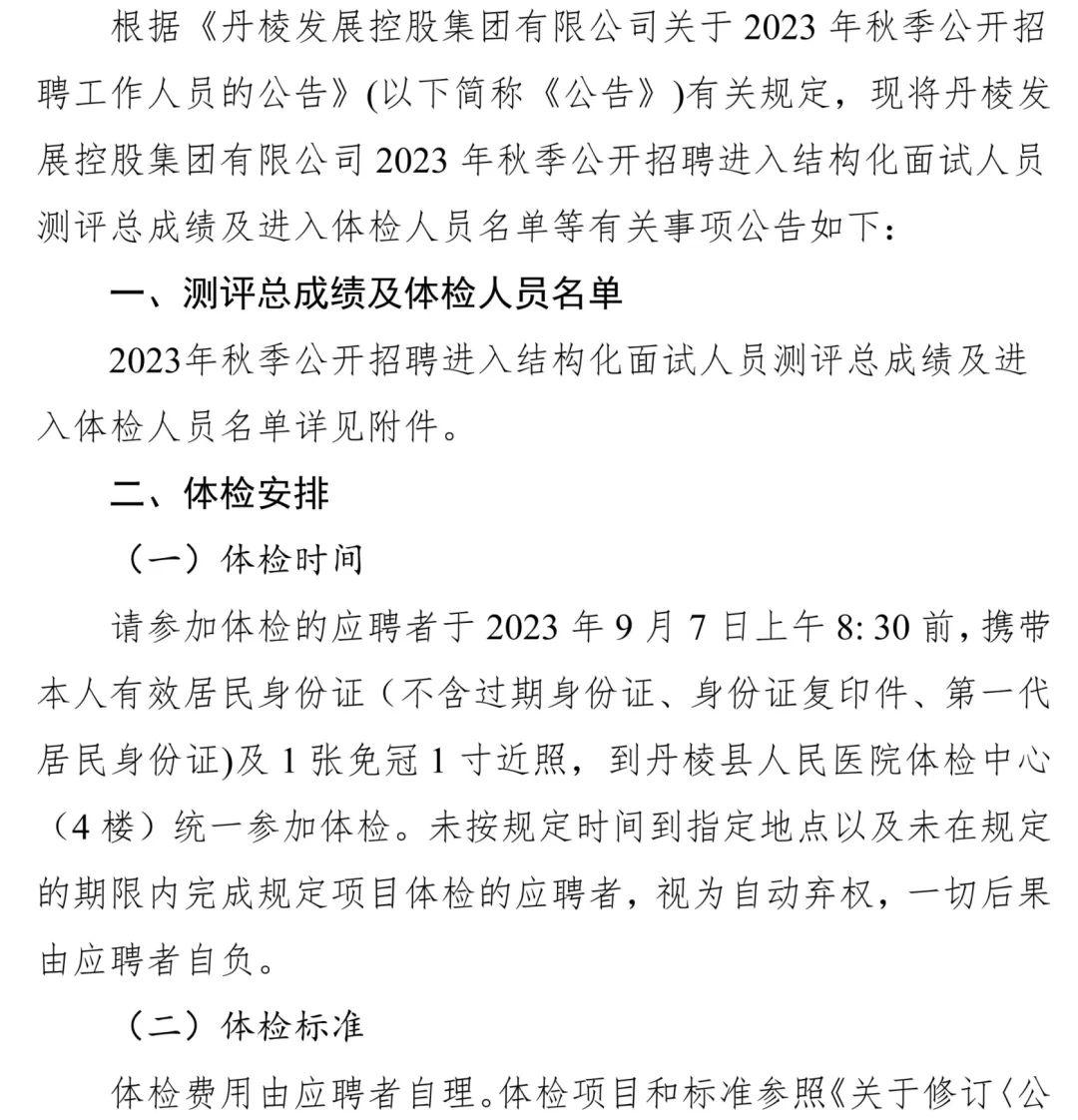 丹棱發(fā)展控股集團有限公司關于2023年秋季公開招聘進入結構化面試人員測評總成績及進入體檢人員的公告