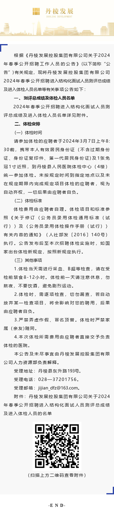 丹棱發(fā)展控股集團有限公司關于2024年春季公開招聘進入結構化面試人員測評總成績及進入體檢人員的公告