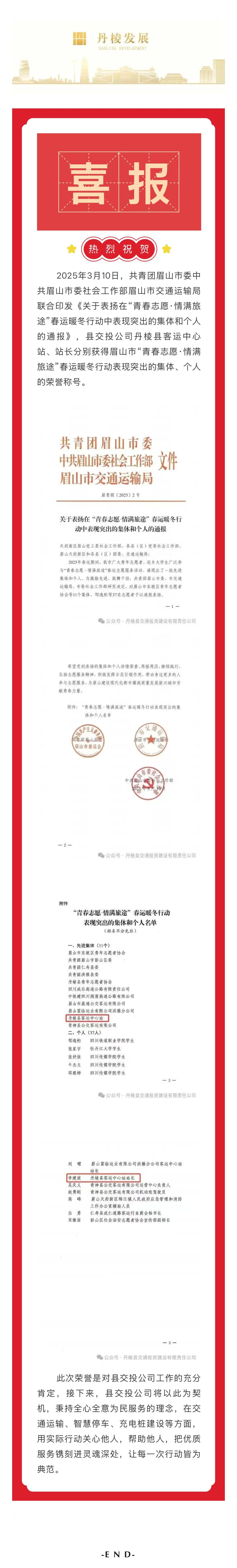 【縣交投公司】喜報!丹棱縣客運中心站、站長分別獲得眉山市“青春志愿·情滿旅途”春運暖冬行動表現(xiàn)突出的集體、個人榮譽稱號
